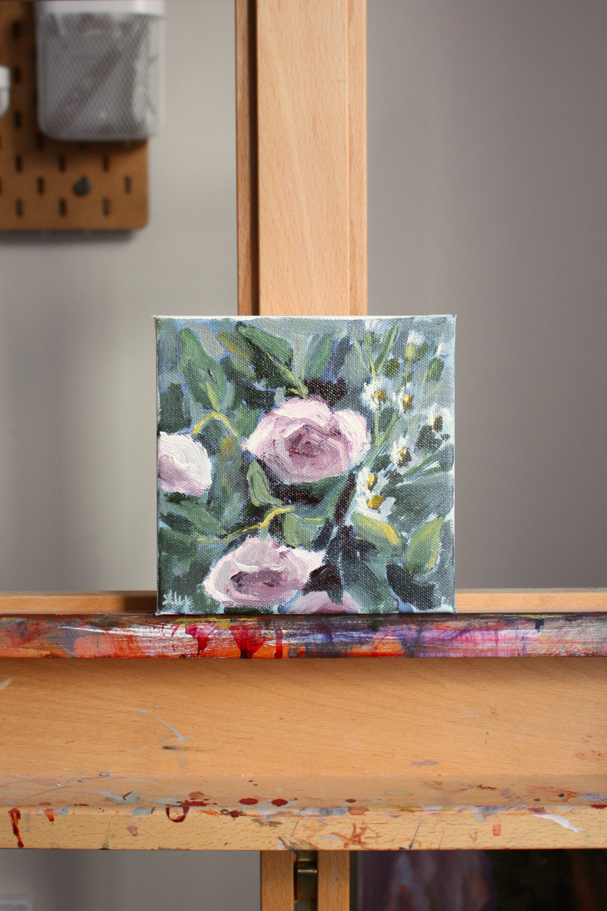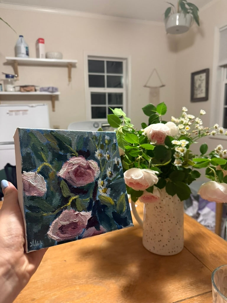 This 6x6 oil on canvas still life painting was painted from life and features garden roses from my best friend's garden.
