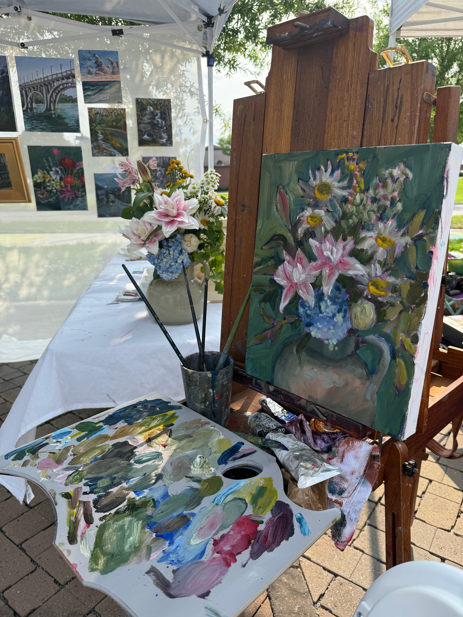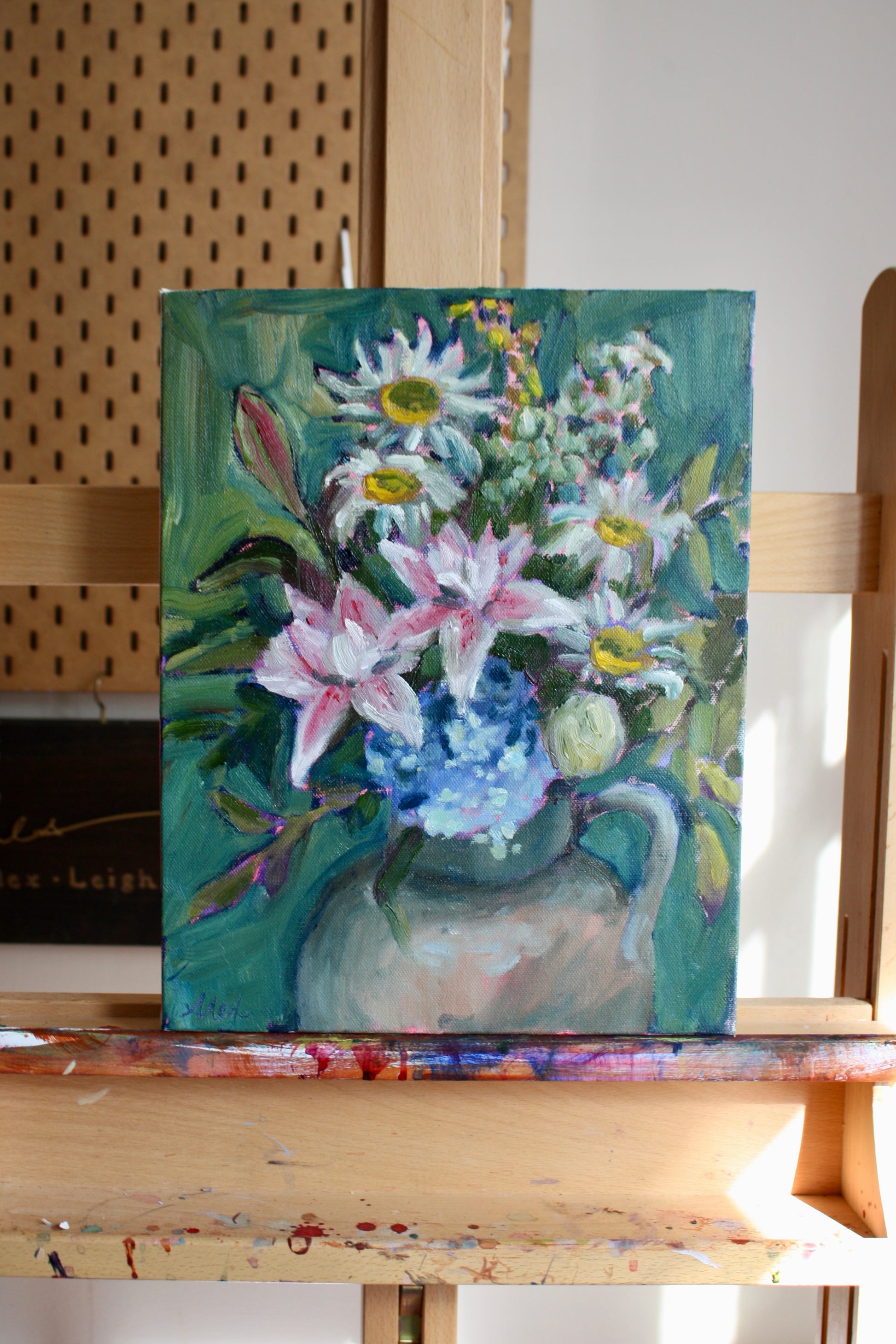This 11x14 oil on canvas still life painting was creating from life and pictures Trader Joe's lilies and daisies from my best friend's yard.