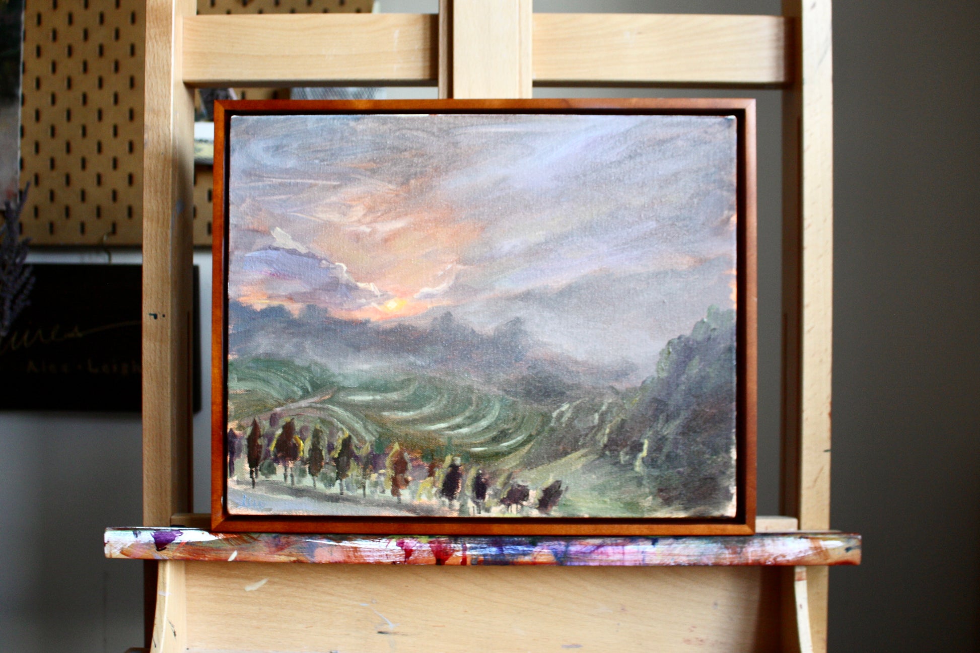 This 11x14 oil on canvas painting was created en plein air as the sun rose over Mercer Orchards in Blue Ridge, GA. This painting comes framed in a dark wood floater frame.