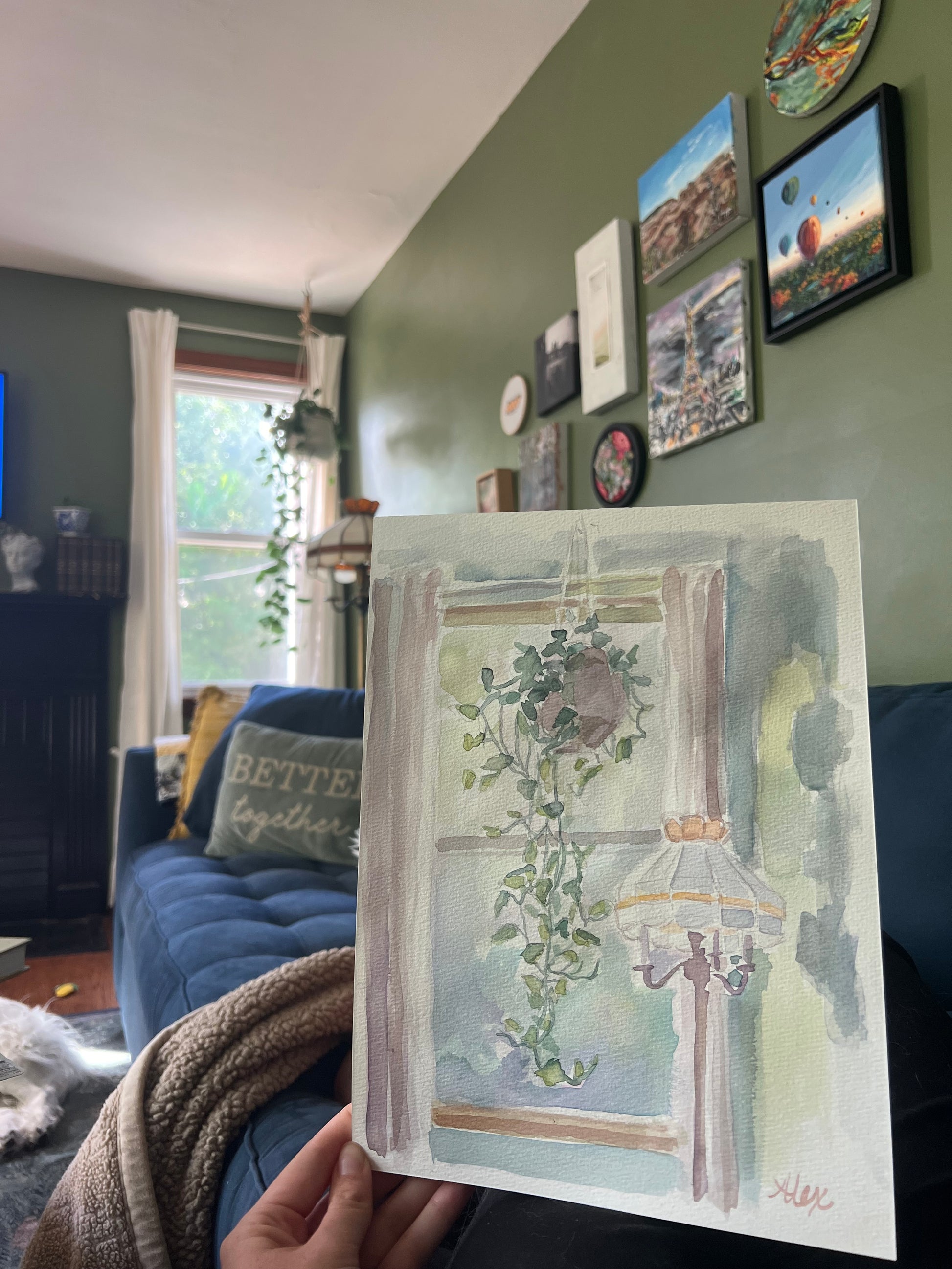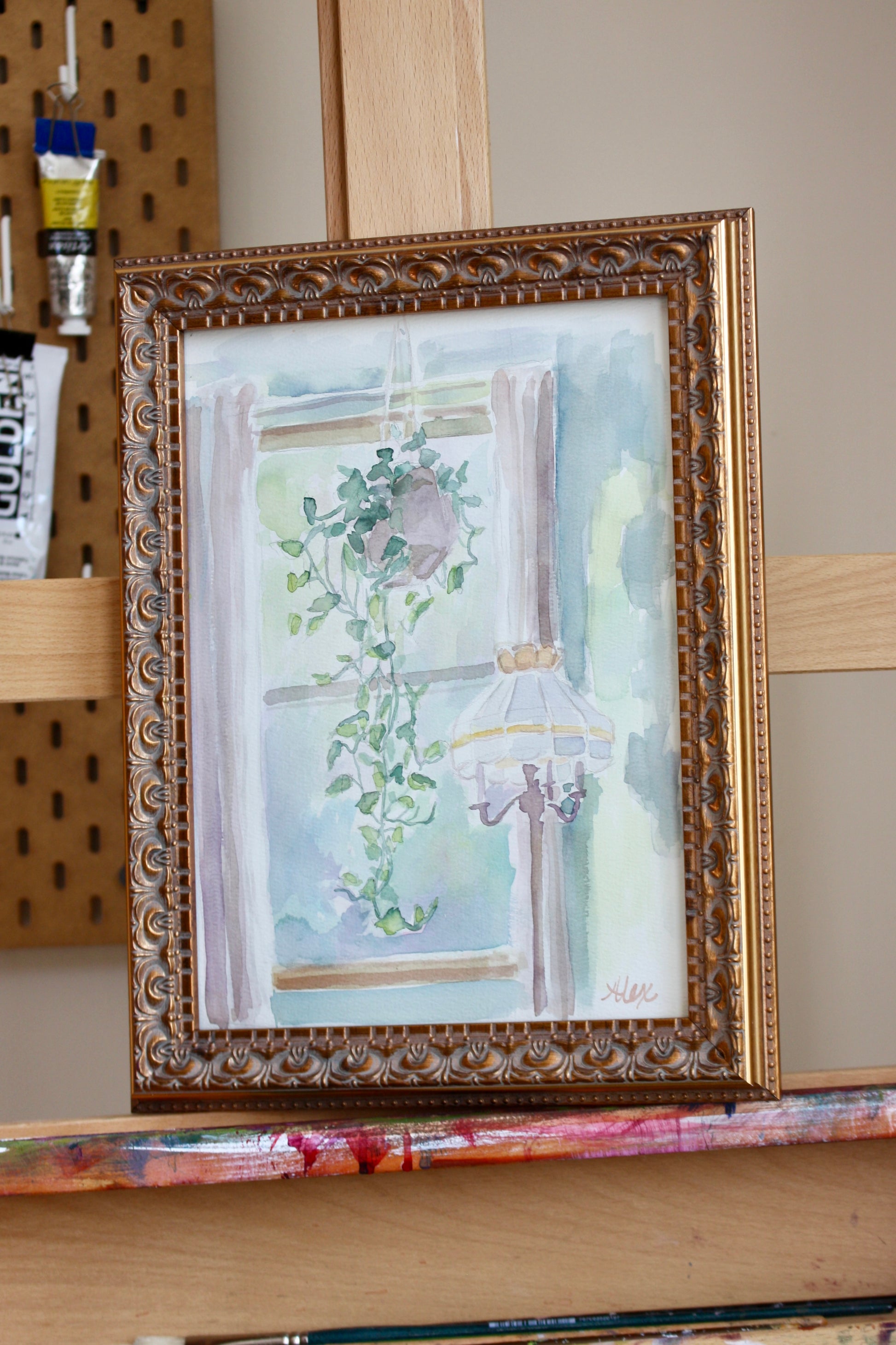 This 9x12 watercolor on paper was created from life in Alex's living room. This painting comes framed in gold.