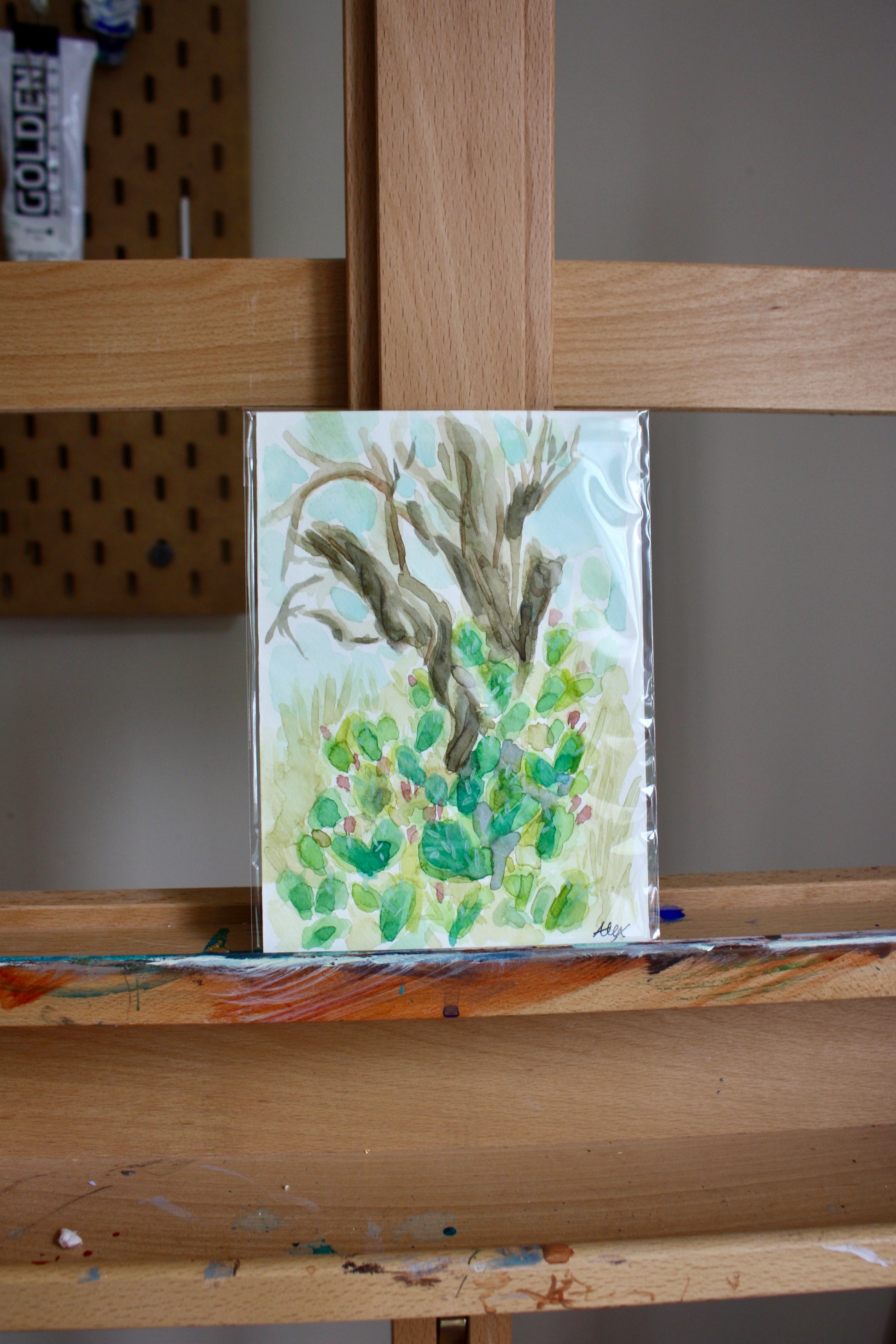 This 5x7 watercolor depicts a prickly pear cactus captured in Sedona, Arizona.
