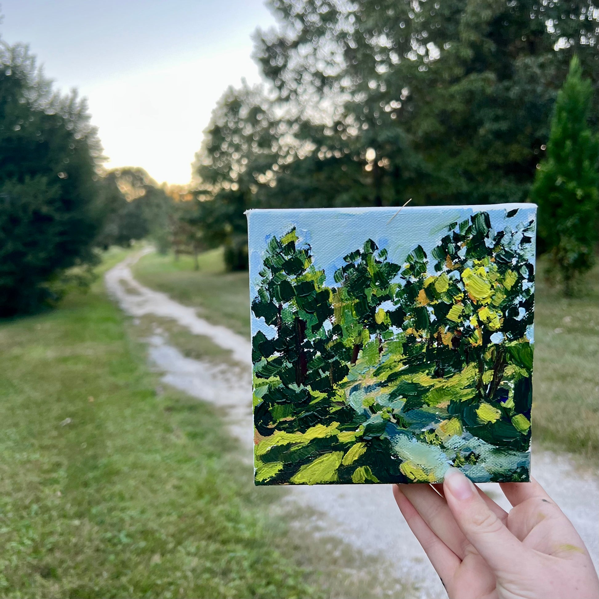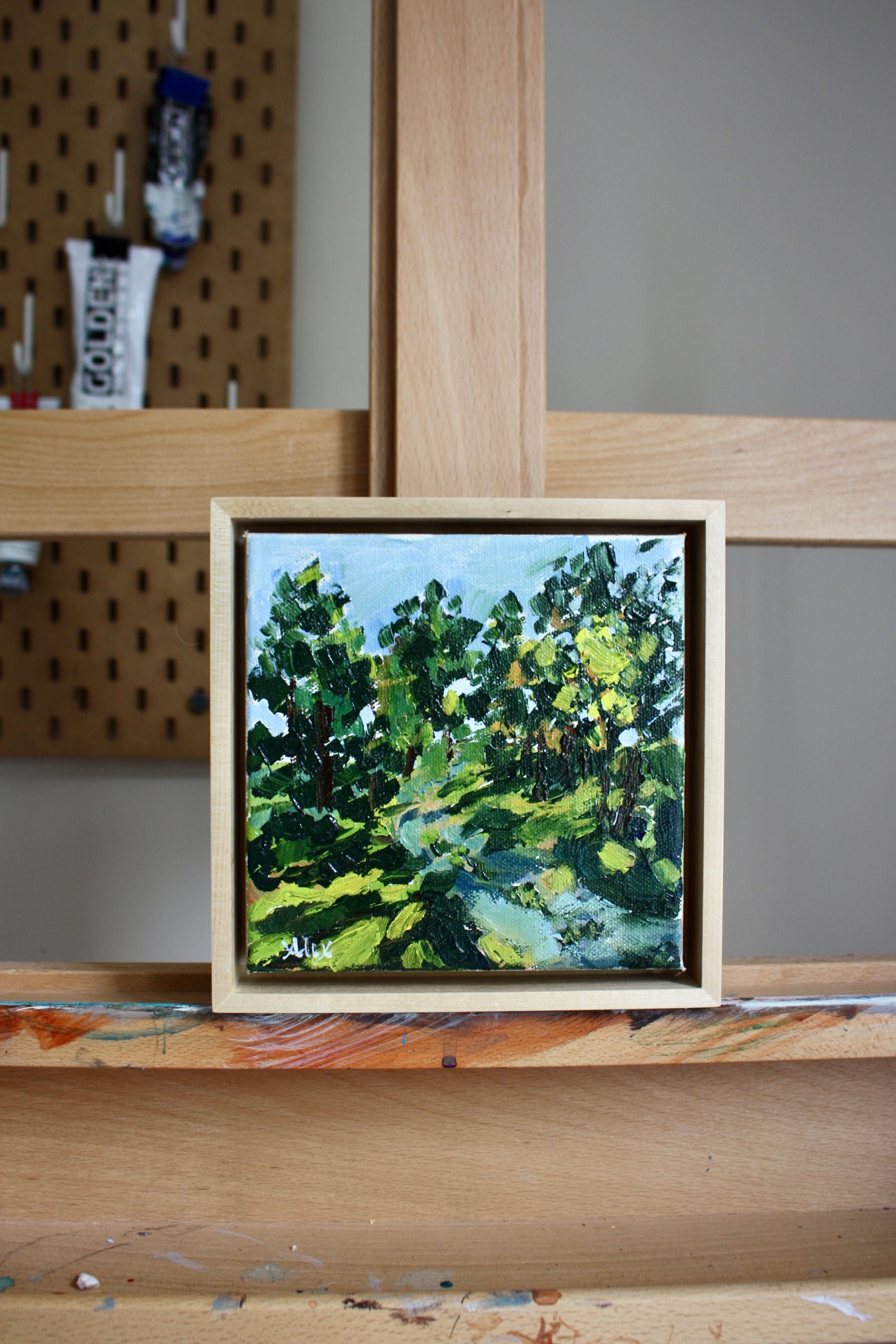 This 6x6 acrylic on canvas painting was created en plein air at the Knoxville botanical garden. This painting comes framed in a natural wood floater frame.