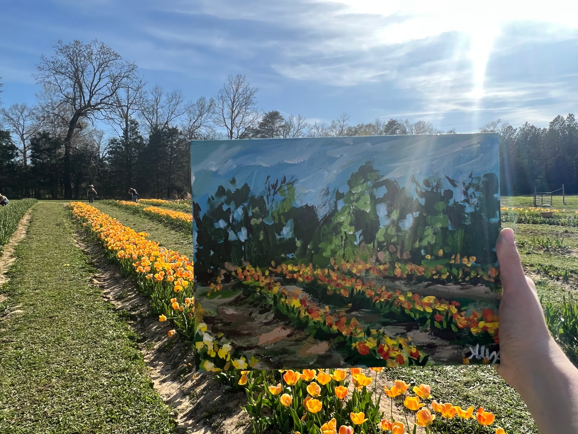 This 9x12 acrylic on canvas painting was created en plein air at Lorenzen Farms in Dayton, Tennessee. This painting comes unframed but is pictured in a natural wood floater frame.